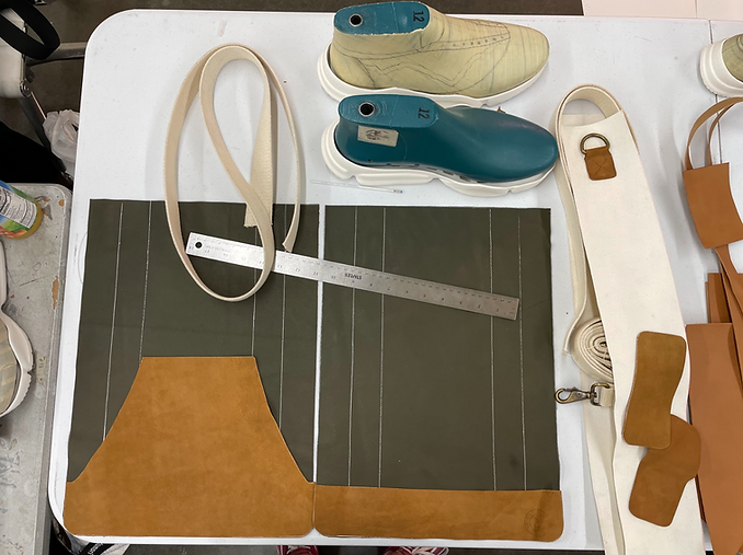 During the manufacturing process of both the shoe and the tote bag ,I got to experiment and learn with a variety of sewing machines. This was a great learning opportunity to be able to understand hands on the limitations and possibilities of different sewing machines, from table sewing machines for flat patterns and vertical post machines for curves and complex surfaces such as closing the back of the shoe.